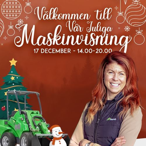 En eftermiddag fylld med inspirerande maskiner, exklusiva erbjudanden och härlig julstämning väntar dig hos oss! Passa dessutom på att ta del av verkstadens specialerbjudanden och diskutera service och reparationer med våra kunniga experter. Vi bjuder på förtäring, julmiljö och trevligt sällskap. Vi erbjuder också unika rabatter på utvalda redskap och tillbehör, så det finns gott om möjligheter att göra klipp inför vinterns arbete.