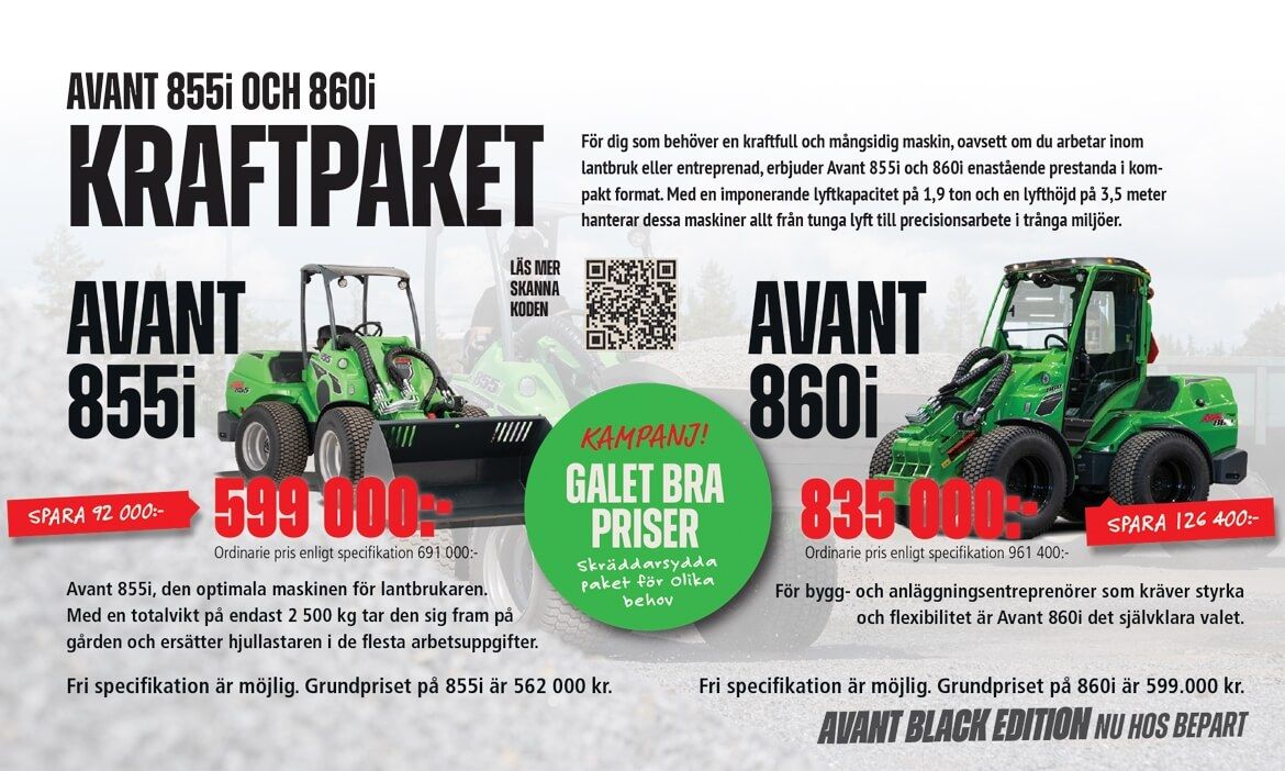 Missa inte den svårslagna kampanjen på Avant 855i och 860i. Den ena lite mer anpassad för lantbrukaren och den andra för entreprenören.